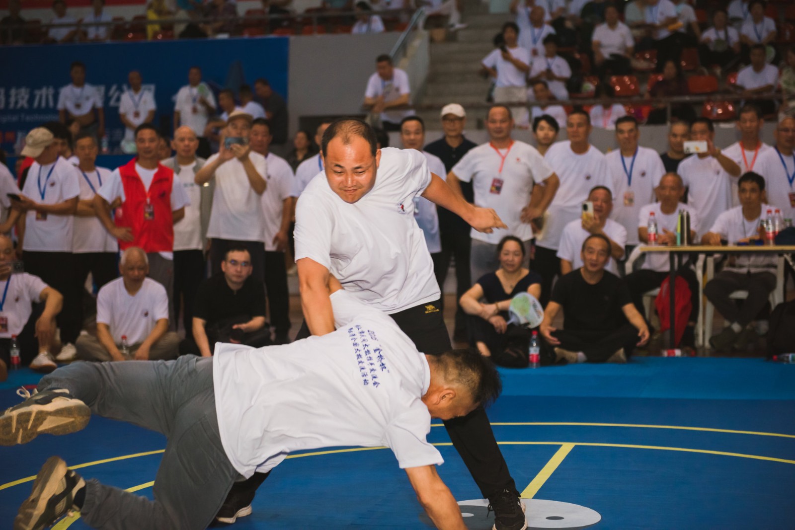 上午九点,活动正式开始。现场分为竞技交流与自由交流两个区域,竞技交流按照正式太极推手比赛的形式,按照年龄段和体重逐一配对开展交流,由专业国家级裁判员赵良秋、胡增凎、林茂斌等现场指导比赛;自由交流则显得更为灵活,定步推手、四正手、听劲摸劲等各种交流形式随意展现,参与的人员也更加广泛。