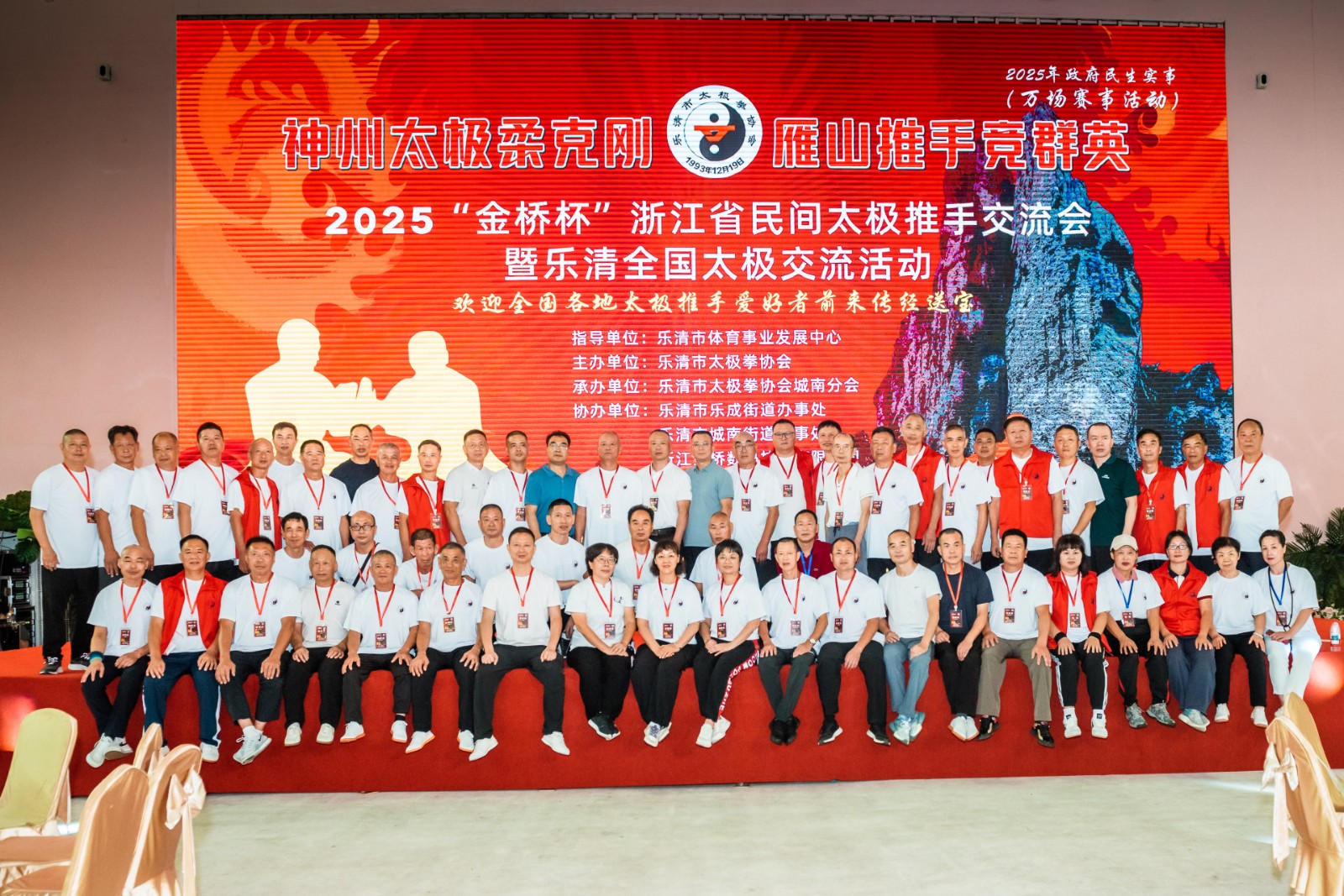 神州太极柔克刚,雁山推手竞群英!2025年9月20日,“金桥杯”浙江省民间太极推手交流会暨乐清市全国太极交流活动在乐清市全民健身运动中心隆重举行。本次活动的指导单位为乐清市体育事业发展中心,由乐清市太极拳协会主办,乐清市太极拳协会城南分会承办。有来自北京、上海、广东、浙江等全国各地45个团队共千余人参加了本次交流活动。乐清市四套班子领导、各相关部门负责人及全国各地太极界知名人士出席了本次活动。