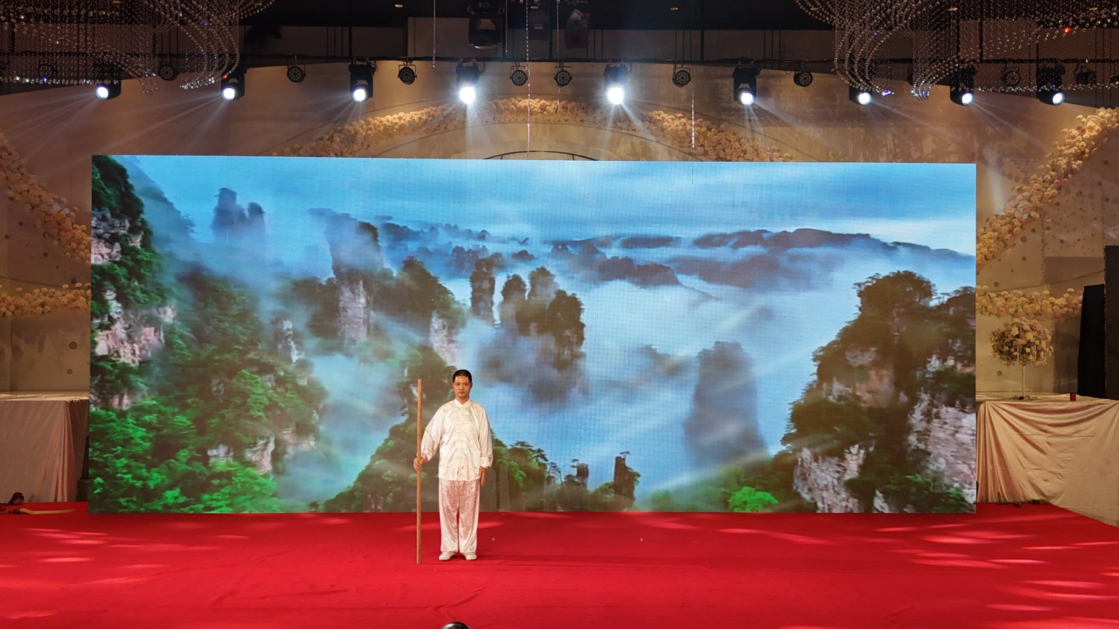 晚上5点开始宴会和武术展演活动,共有21个不同风格节目,城南太极拳分会会长叶永晓表演了少林齐眉棍。
