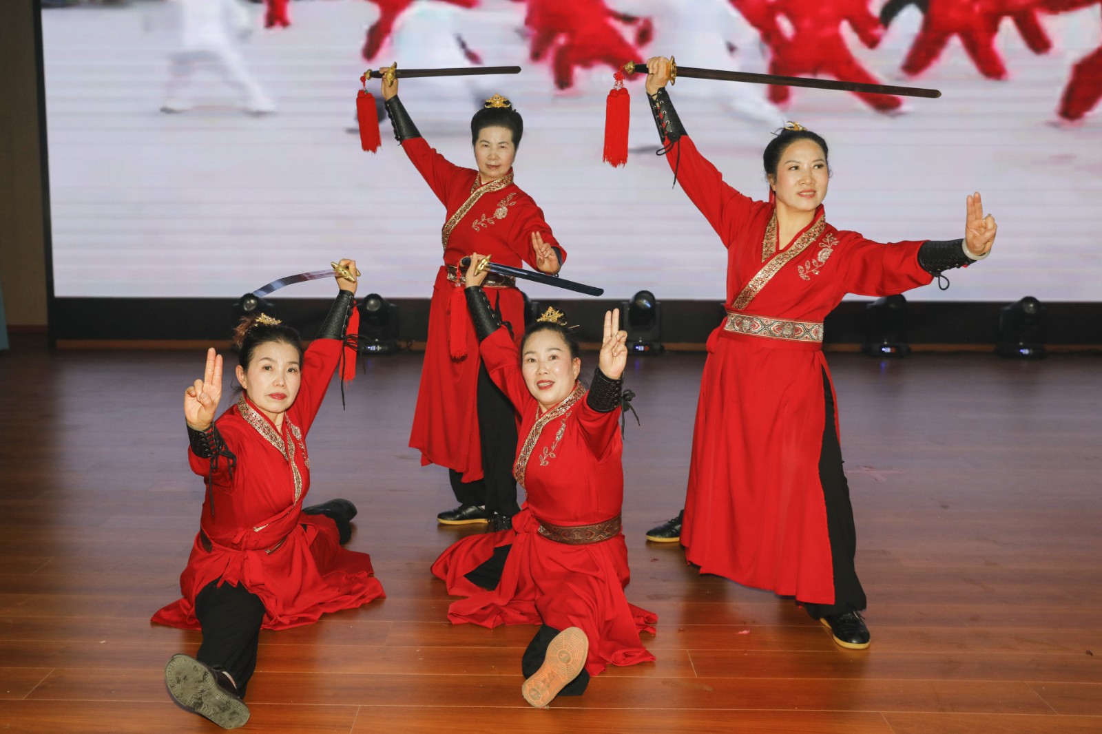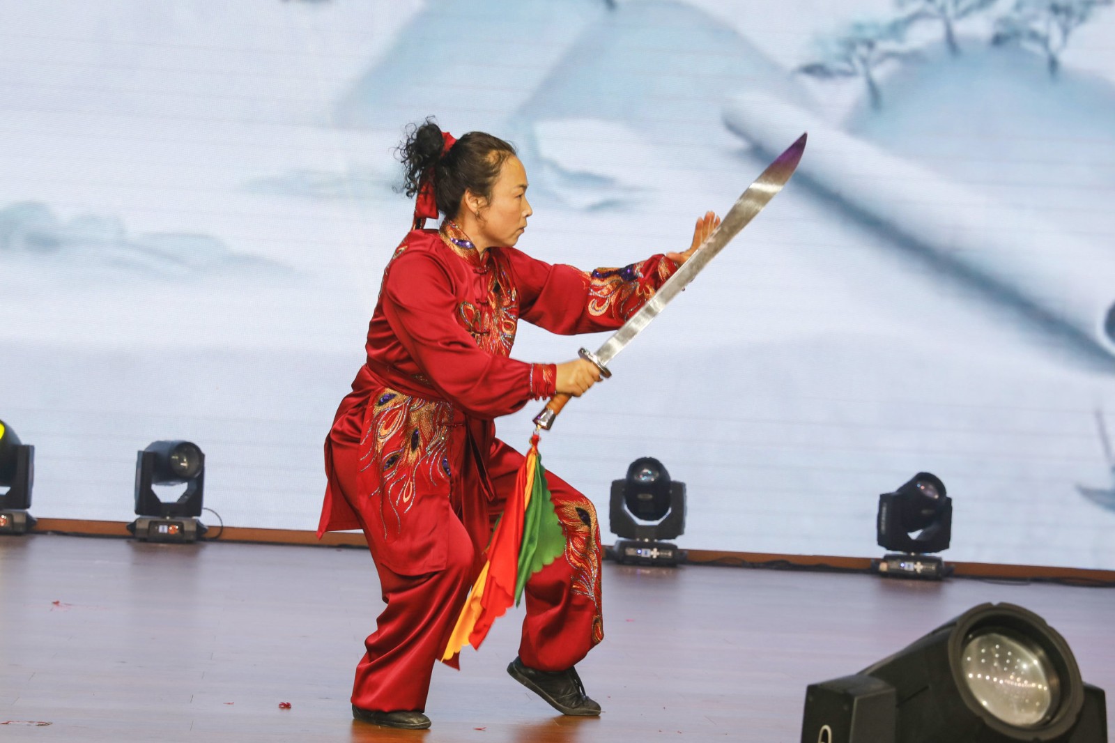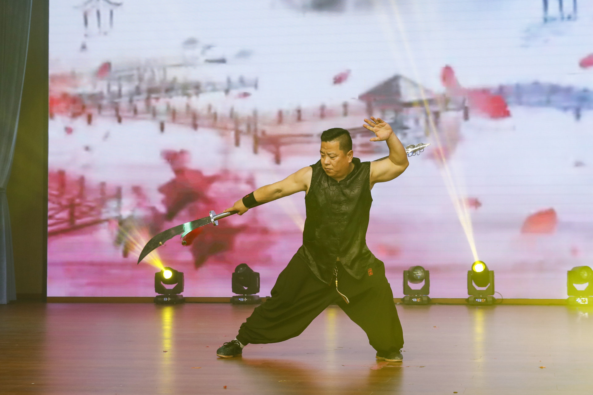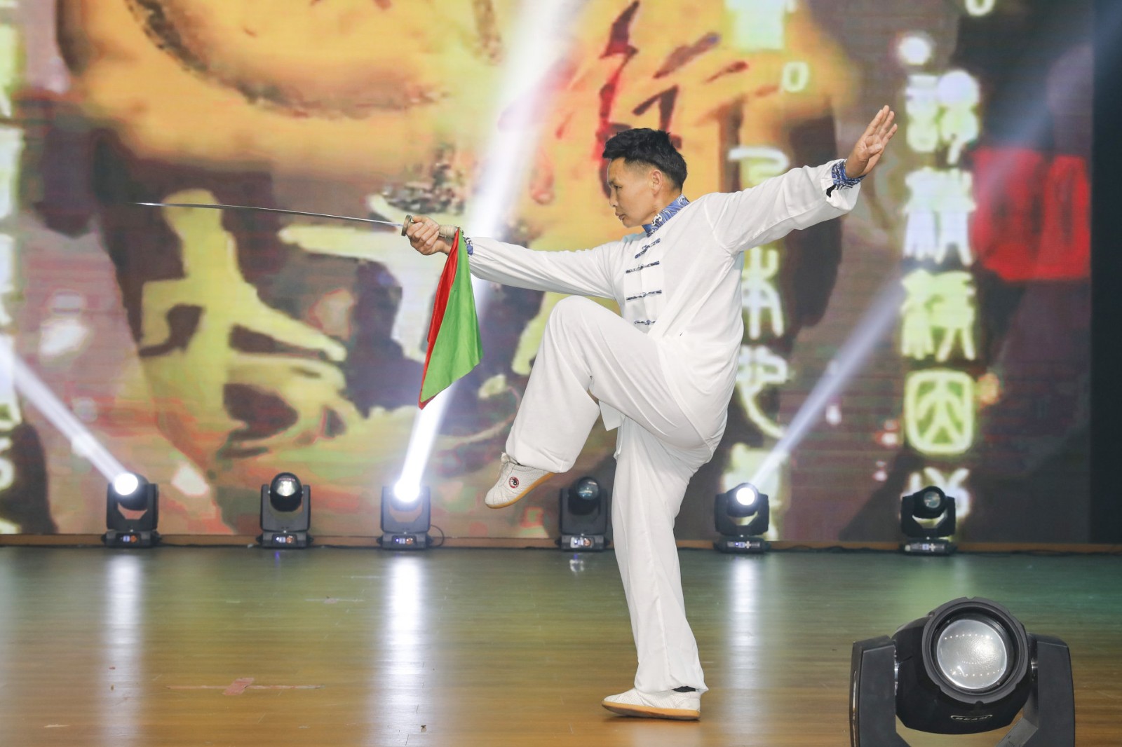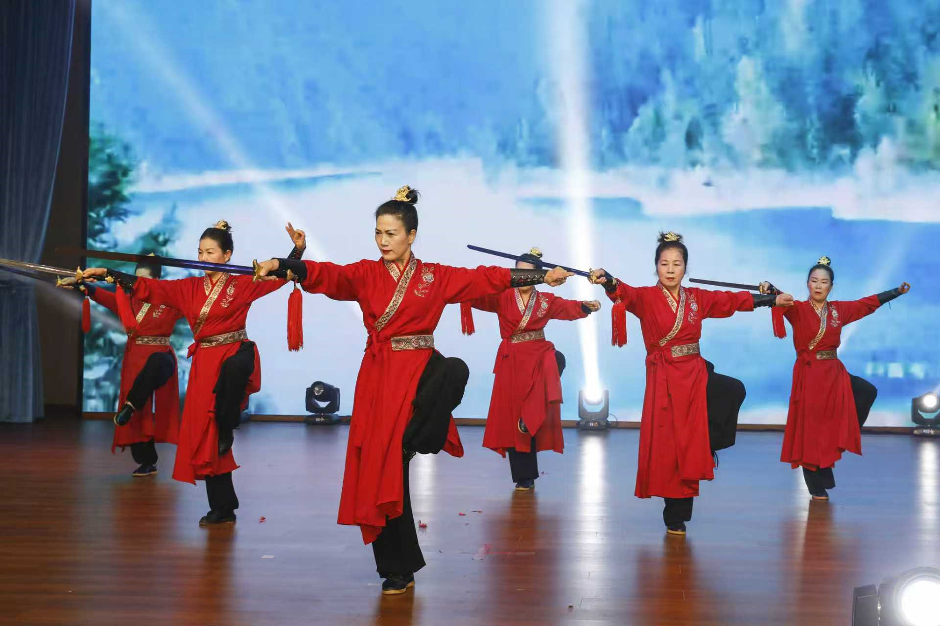 舞台之上,是刚柔并济的视觉盛宴。少儿武术组合率先登场,孩子们一招一式有板有眼,眼神坚定、动作利落,尽显中华武术的精气神,赢得了全场阵阵喝彩。随后,精彩节目轮番上演:从单人太极剑的行云流水,到双人春秋大刀的气势如虹;从集体剑术的整齐划一,到枪术表演的飒爽英姿,每一个招式都凝聚着对太极文化的深刻理解与热爱。水墨山水的背景前,红色的武服与银色的剑刃交相辉映,将中华武术的力与美展现得淋漓尽致。