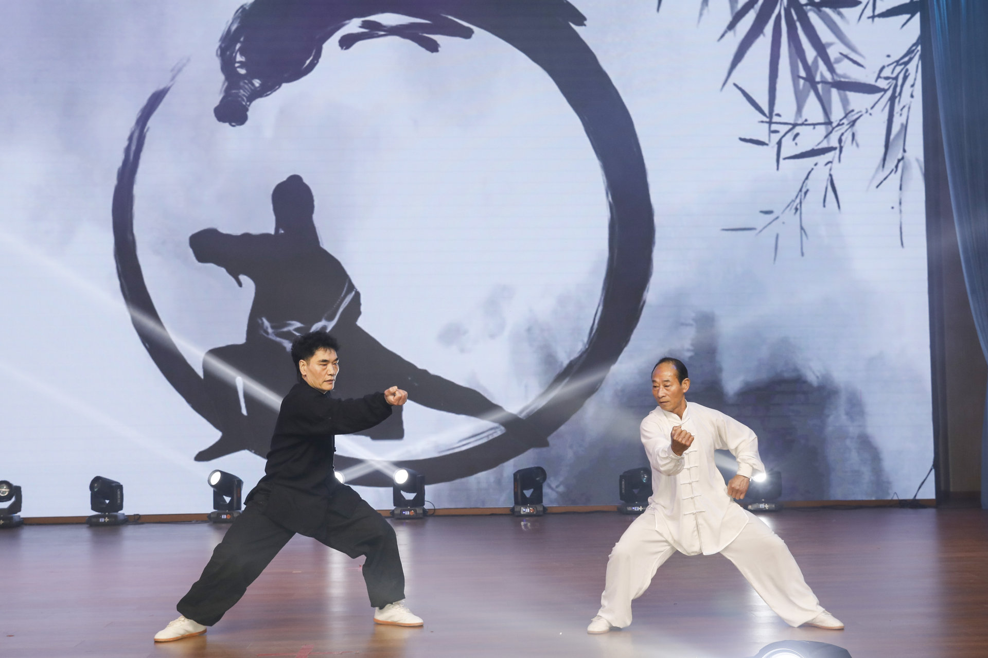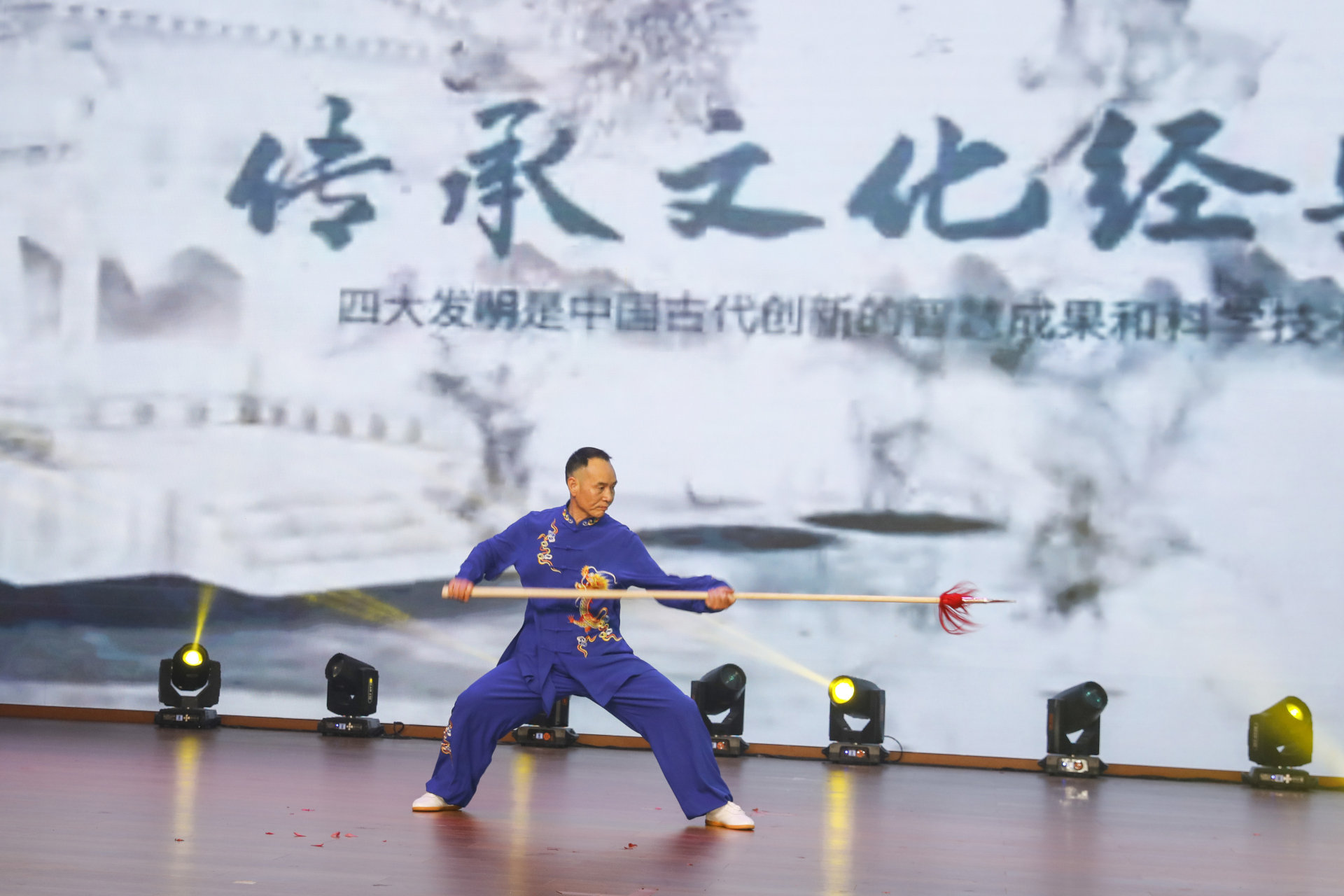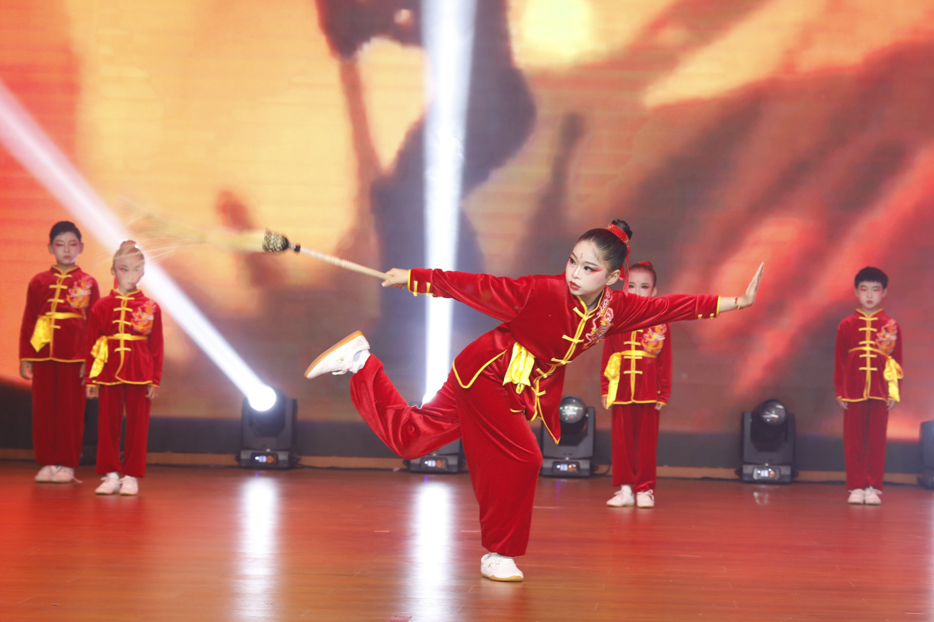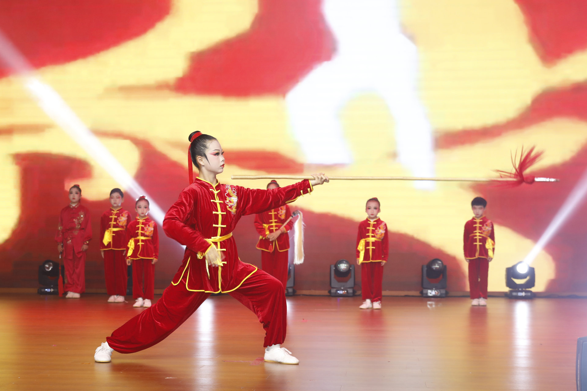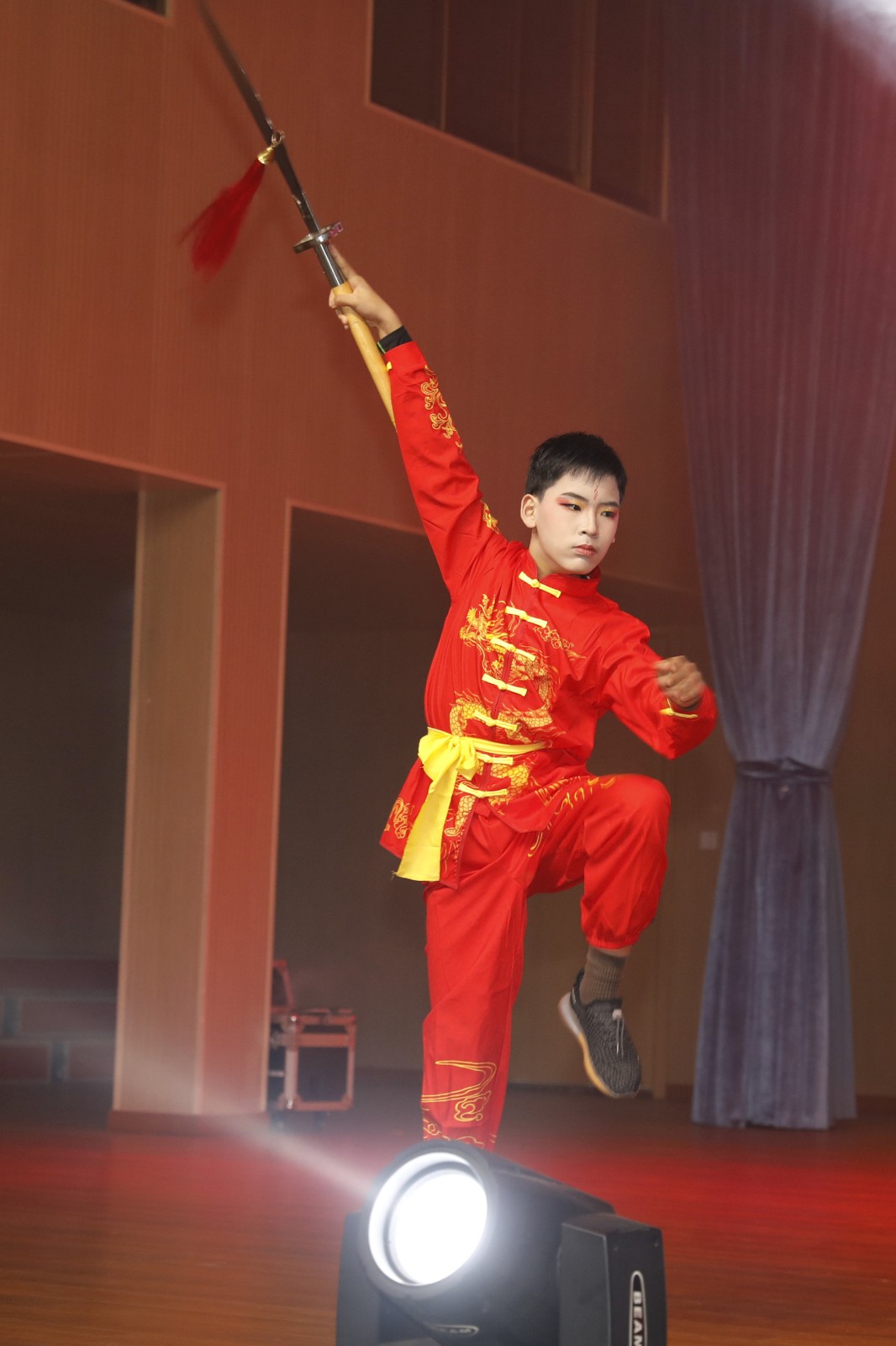 舞台之上,是刚柔并济的视觉盛宴。少儿武术组合率先登场,孩子们一招一式有板有眼,眼神坚定、动作利落,尽显中华武术的精气神,赢得了全场阵阵喝彩。随后,精彩节目轮番上演:从单人太极剑的行云流水,到双人春秋大刀的气势如虹;从集体剑术的整齐划一,到枪术表演的飒爽英姿,每一个招式都凝聚着对太极文化的深刻理解与热爱。水墨山水的背景前,红色的武服与银色的剑刃交相辉映,将中华武术的力与美展现得淋漓尽致。