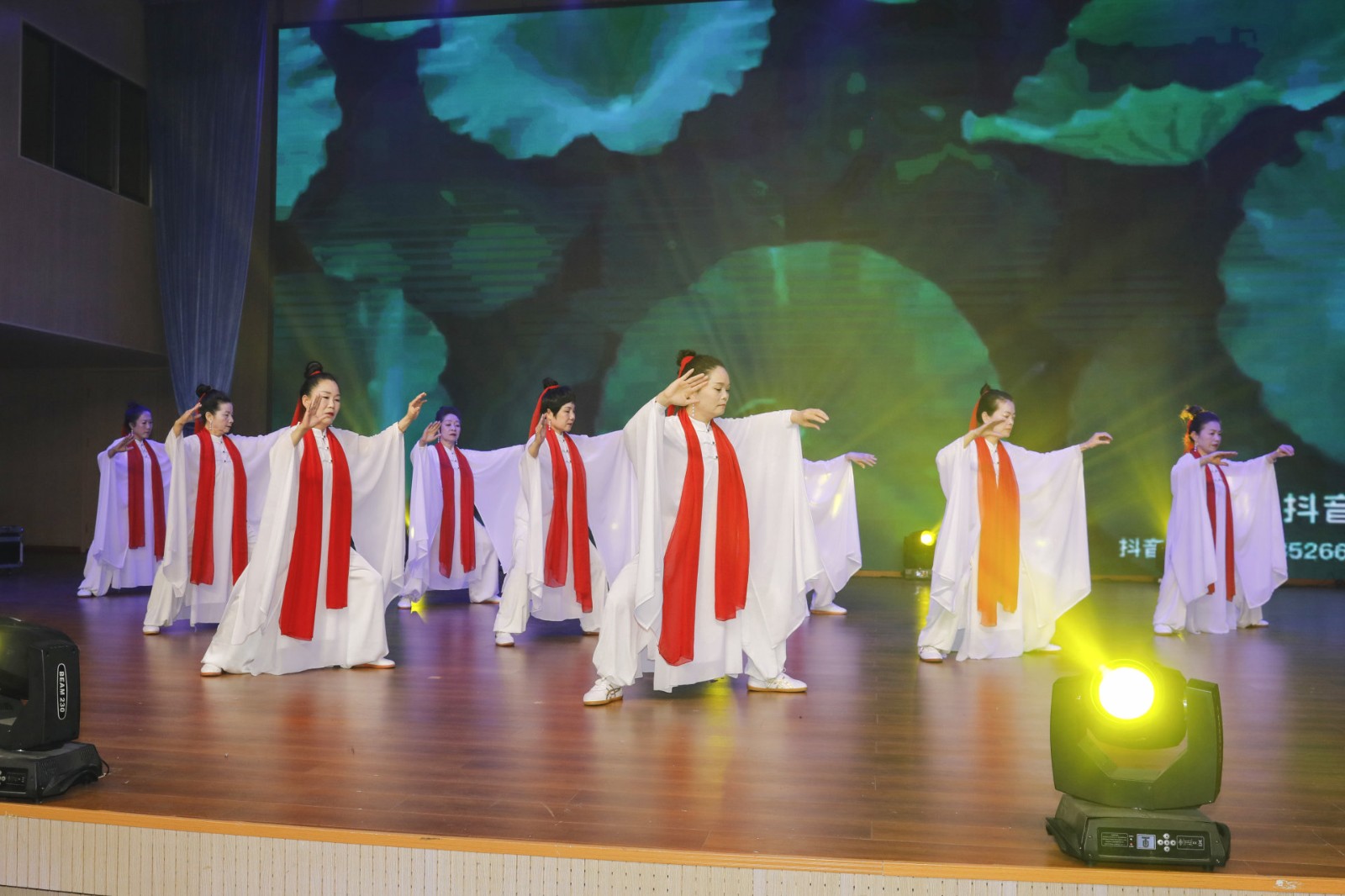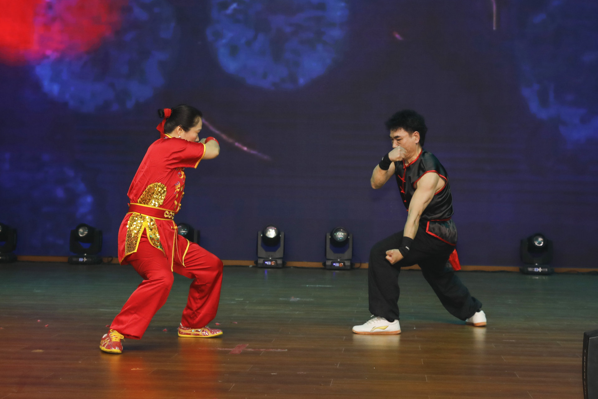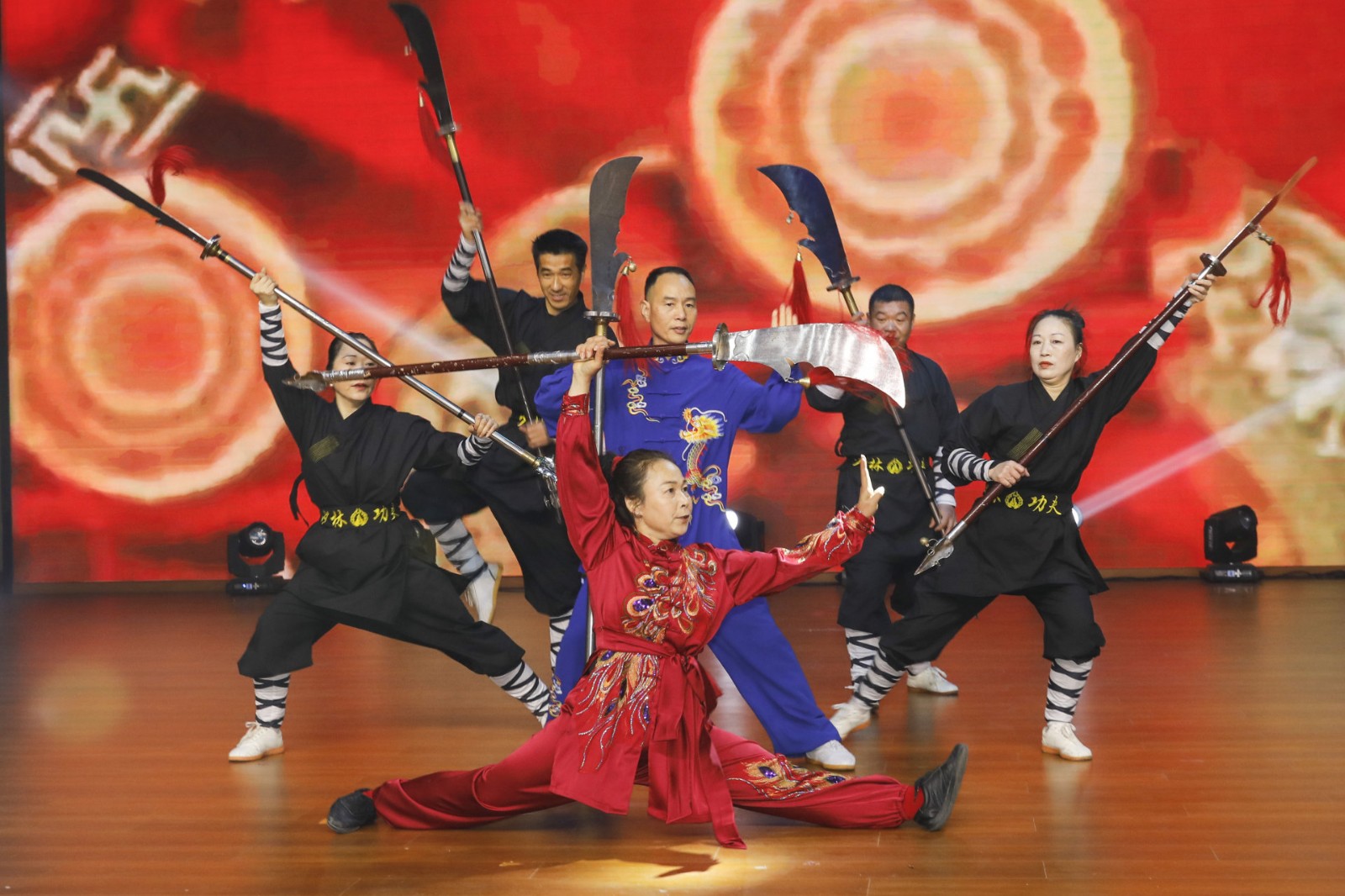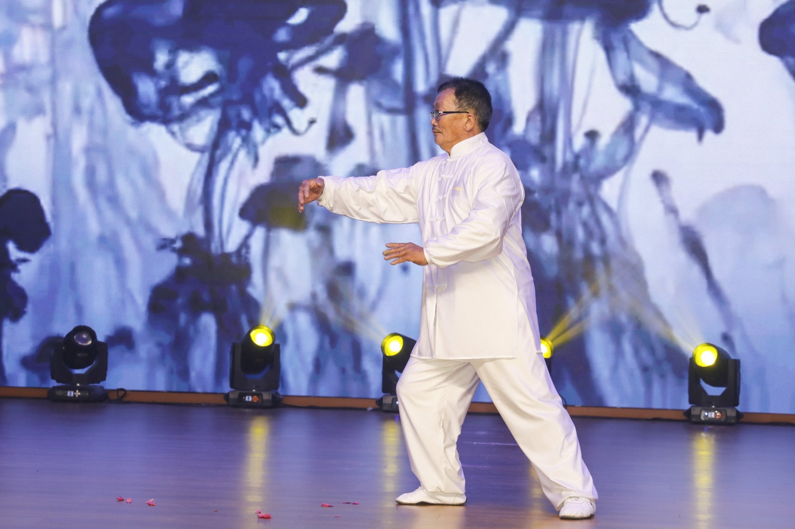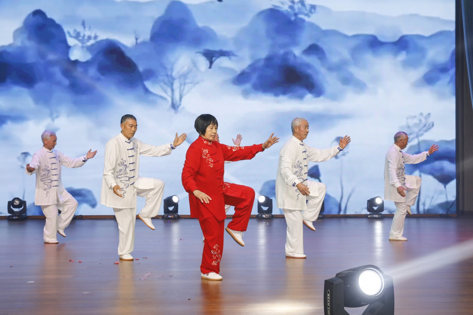舞台之上,是刚柔并济的视觉盛宴。少儿武术组合率先登场,孩子们一招一式有板有眼,眼神坚定、动作利落,尽显中华武术的精气神,赢得了全场阵阵喝彩。随后,精彩节目轮番上演:从单人太极剑的行云流水,到双人春秋大刀的气势如虹;从集体剑术的整齐划一,到枪术表演的飒爽英姿,每一个招式都凝聚着对太极文化的深刻理解与热爱。水墨山水的背景前,红色的武服与银色的剑刃交相辉映,将中华武术的力与美展现得淋漓尽致。