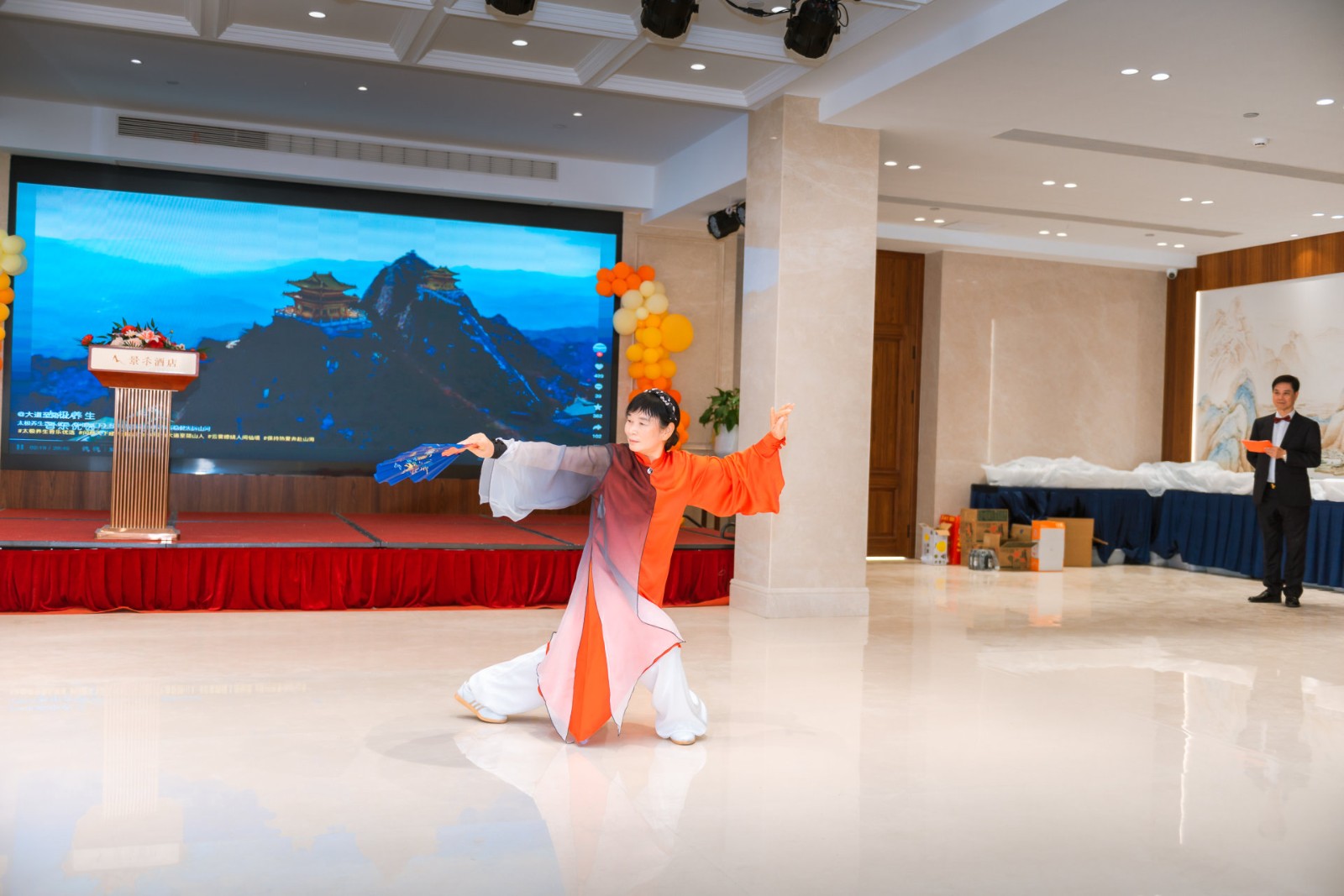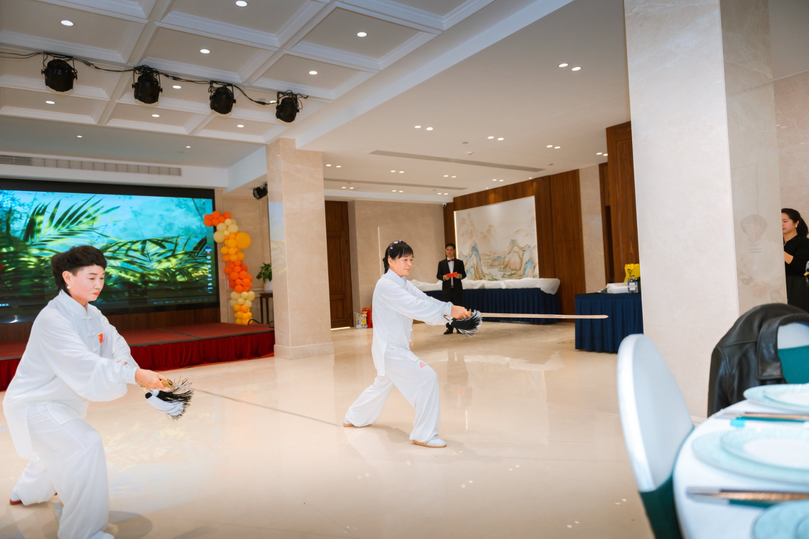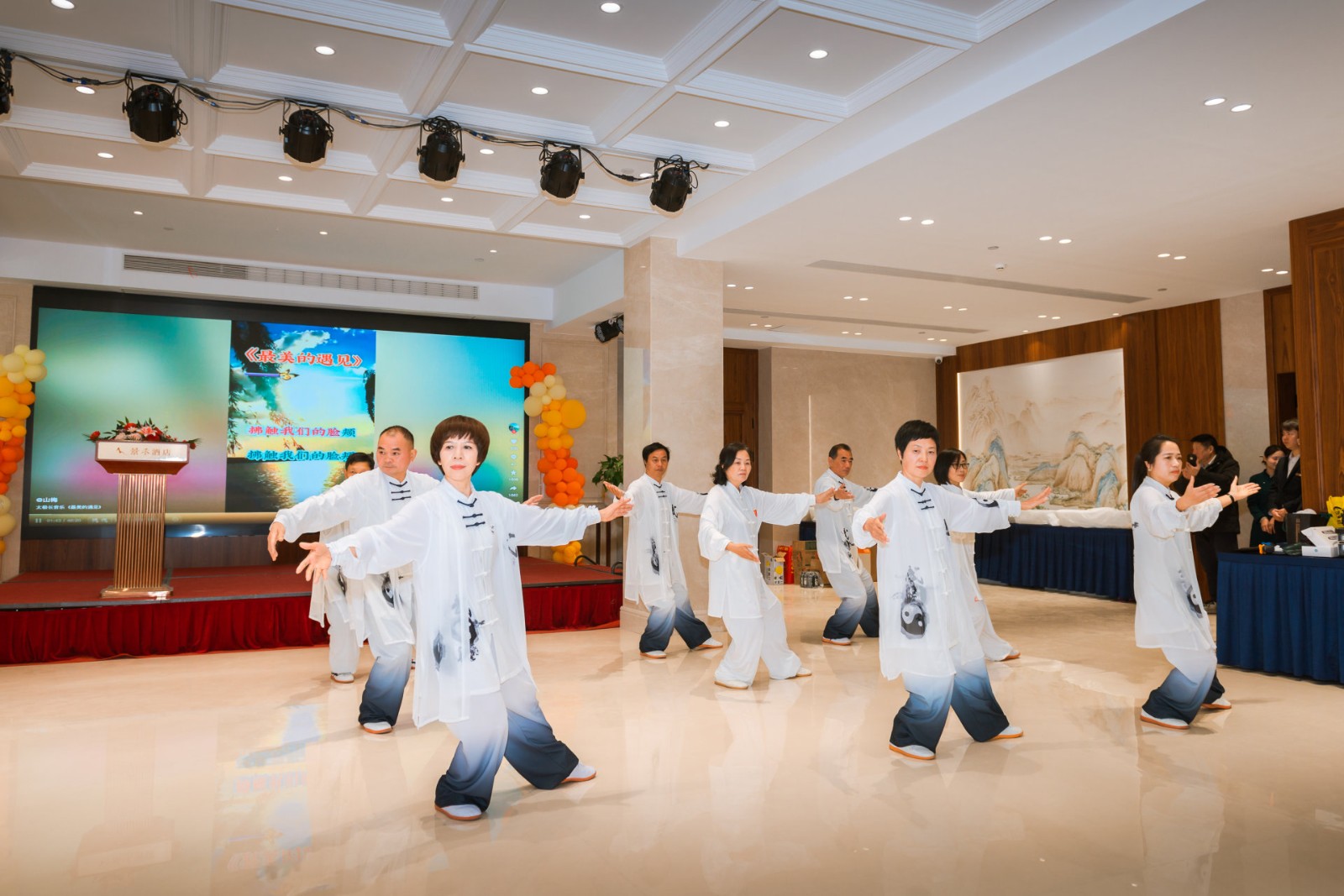汇报致辞环节后,精彩的太极展演正式拉开帷幕,14个节目轮番登场,亮点纷呈。夏静、陈微芬等带来的集体《24式太极拳》行云流水,开启武韵篇章;戴雅芬、章仁德等演绎的《八段锦》柔和雅致,尽显养生智慧;张品才的《武当养生拳》、钱格特的《八卦掌》、林昌胜的《武当剑》各展所长,或藏道法自然,或显掌法灵动,或露剑韵悠长;郑乐娟等六人联袂的《32式太极剑》剑光翩跹,戴雅芬等六人呈现的《42式太极拳》融各家之优,腾超英率众弟子的集体《杨氏太极拳》舒展大气,尽显太极多元魅力;黄学勇的《混元太极拳》劲力浑厚,陈小蕊的《陈氏56式太极拳》刚柔并济,谢秋月的《新编28式太极扇》武舞相融,戴雅芬与谢秋月合作的《49式陈氏太极剑》别具一格,每一个表演都赢得现场阵阵掌声。